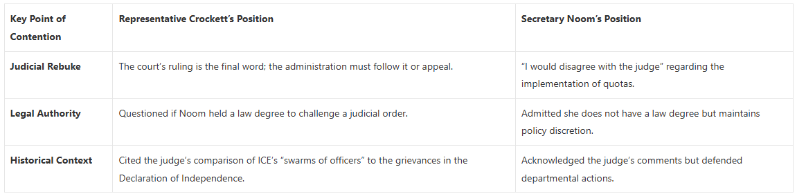 Crockett’s line of questioning regarding Noom’s lack of a law degree was a strategic maneuver to highlight a perceived arrogance in the executive branch—specifically, the idea that a cabinet secretary can “disagree” with a standing court order to justify continuing a disputed policy. By framing the department’s actions as a violation of the foundational compact of the country, Crockett moved the debate from policy technicalities to constitutional integrity.