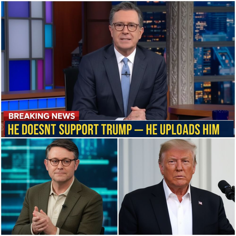 “It’s impressive,” Colbert observed dryly, “to see a Speaker who doesn’t just support Trump — he uploads him,” and the studio exploded into sustained, incredulous applause.