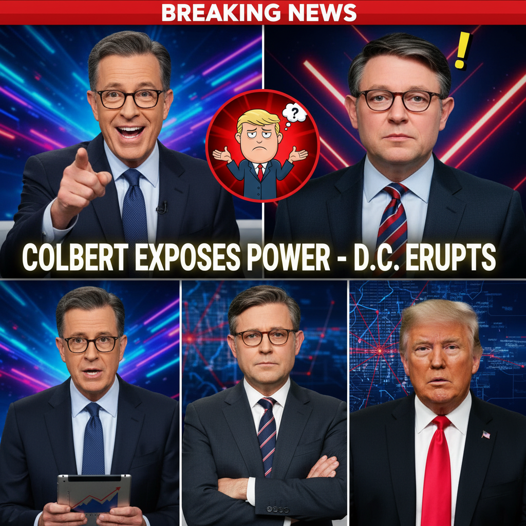 “It’s impressive,” Colbert observed dryly, “to see a Speaker who doesn’t just support Trump — he uploads him,” and the studio exploded into sustained, incredulous applause.